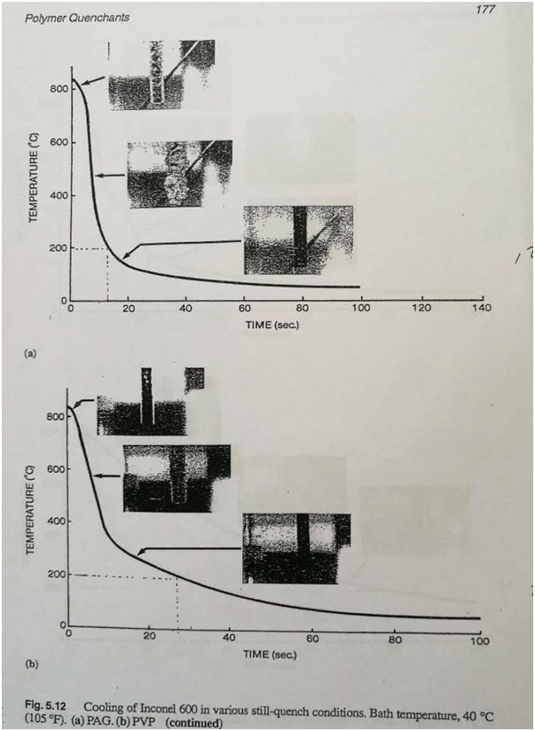 在繼續(xù)冷卻過(guò)程中,出現(xiàn)個(gè)突變過(guò)程,蒸汽膜破裂,這不是核沸騰(如傳統(tǒng)上所描述的),因?yàn)橛械哪さ膹?qiáng)度影響沸騰過(guò)程。例如,PSA和 PVP 淬火介質(zhì)的冷卻先是膜破裂引起的。PSA 出現(xiàn)膜破裂比起 PVP伴隨有很多較小對(duì)膜的損傷,至少存在于這次測(cè)試不攪拌條件下。PEOX淬火介質(zhì)同樣經(jīng)歷膜破裂過(guò)程,但是破裂出現(xiàn)伴隨有部分聚合物釋放到溶液里,因?yàn)榫酆衔锊蝗芙庑砸鹑芤旱臏啙幔@是由于膜的溫度高于聚合物濁點(diǎn)。PAG 淬火介質(zhì)不形成連續(xù)的膜,也不出現(xiàn)膜的破裂。同 PVP、PSA 及PEOX 比較,PAG 在冷卻行為上的差異或許是因?yàn)樗偷姆肿又亓亢偷偷木酆衔锬?qiáng)度。另外,溶液渾濁是因?yàn)樵搮^(qū)溫度高于共聚物濁點(diǎn)的結(jié)果。